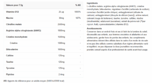 | L-Citrulline Malate | 5 g | Augmentation du flux sanguin et “muscle pump” |