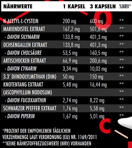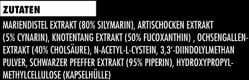 Liste des ingrédients : Extrait de chardon-marie (80% silymarine), extrait d’artichaut (5% cynarine), extrait de fucus (50% fucoxanthine), extrait de bile d’ox (40% acide cholique), N-Acetyl-L-Cystéine, extrait de brocoli, extrait de poivre noir (95% pipérine), capsule végétale (hydroxypropylméthylcellulose).