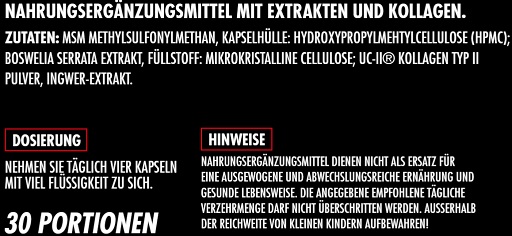 Liste complète des ingrédients : UC II® type II collagen (undenaturé), MSM, extrait de boswellia serrata standardisé en acides boswelliques, agents de charge (cellulose microcristalline), enveloppe de la capsule : hydroxypropylméthylcellulose (HPMC).