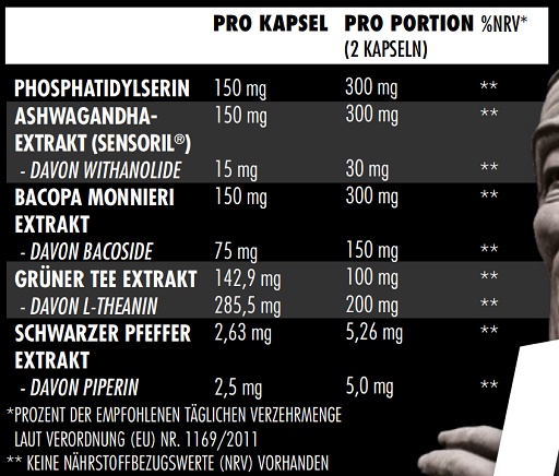 Liste des ingrédients : Ashwagandha (Sensoril® KSM-66) extrait 5:1, phosphatidylsérine poudre (70 % phosphatidylsérine), Bacopa monnieri extrait (50 % baccosides), extrait de thé vert (standardisé 70 % L-Théanine), extrait de poivre noir (piperine), hydroxypropylméthylcellulose (capsule végétale).