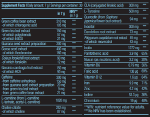 - 26 ingrédients actifs dont 9 extraits végétaux (café vert, guarana, thé vert, cayenne, forskoline)