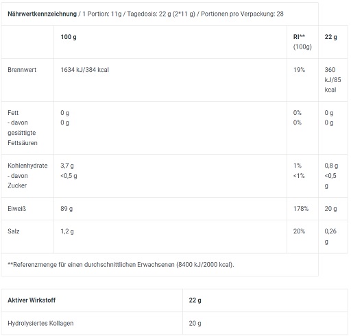 | Collagène hydrolysé | 91 % (soit 20 g par dose) | 20 g |