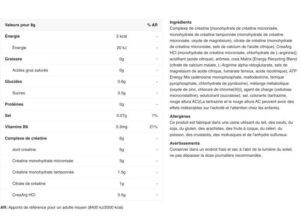 - Principaux ingrédients actifs: 3 g de créatine (monohydrate, citrate et pyruvate), 2 g de BCAA (L-Leucine, L-Isoleucine, L-Valine), 1,5 g de L-arginine, vitamines B6 et niacine, magnésium, fer