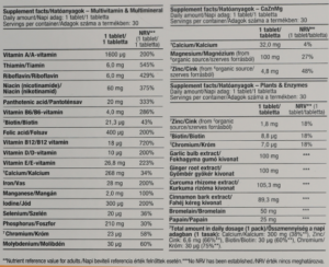 Multivitamin & Multimineral: vitamines A, C, D, E, K, B1, B2, B6, B12, acide folique, biotine, calcium, magnésium, zinc, fer, cuivre, manganèse, molybdène, sélénium, etc.