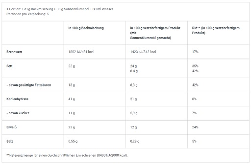 Mode d’emploi : Préchauffer le four à 200 °C. Mélanger 120 g du mélange (environ 6 cuillères à soupe bien remplies) avec 80 ml d’eau et 30 g d’huile de tournesol (3 cuillères à soupe), jusqu’à dissolution complète des grumeaux. Enfourner pendant 15 minutes, laisser reposer 10 minutes avant de découper et déguster.