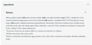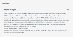 Liste complète des ingrédients : Isolat de protéine de lactosérum native, arômes naturels et artificiels selon le parfum, émulsifiant (lécithine de soja), édulcorants (sucralose, acésulfame-K selon les versions). Produit sans lactose*, sans gluten et sans huile de palme.