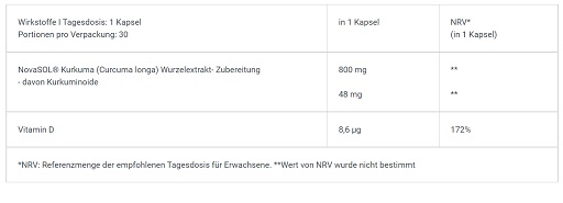 | Extrait liquide de racine de curcuma NovaSOL® (Curcuma longa) | 800 mg |