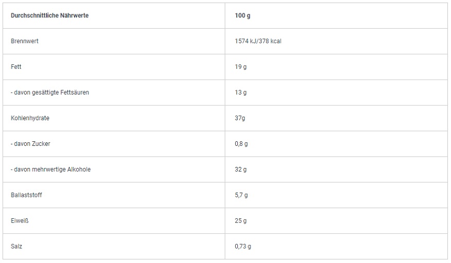 Ingrédients : Humectants (maltitols, glycérol), enrobage au chocolat [édulcorant (maltitols), graisses végétales hydrogénées (noix de coco, colza), poudre de cacao allégée en matières grasses, émulsifiant (lécithines)], protéines de riz (contient soja), protéines de pois, huile de coco raffinée, fructooligosaccharides, poudre de cacao allégée, soja extrudé, eau, émulsifiant : lécithines, farine d’amande, arômes, gélifiant (carraghénane), conservateur (sorbate de potassium), stabilisant (chlorure de potassium), antioxydant (alpha-tocophérol).
