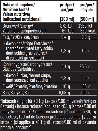 Mode d’emploi : Agiter la bouteille avant utilisation. À consommer immédiatement après l’effort ou en collation riche en protéines au cours de la journée. Sur les jours sans entraînement, il est conseillé de prendre un shake entre les repas pour maintenir un apport protéique optimal.