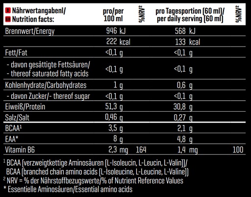 Body Attack® Liquide Aminé De Bœuf 1L est un complément alimentaire liquide à base d’hydrolysat de protéines de bœuf. Ce produit se distingue par sa richesse exceptionnelle en acides aminés essentiels (EAA) et en acides aminés à chaîne ramifiée (BCAA), offrant 4800 mg d’EAA et 2100 mg de BCAA par dose de 60 ml, équivalent à environ 30 g de protéines par ration quotidienne. Enrichi en vitamine B6, il favorise le métabolisme énergétique et aide à lutter contre la fatigue lors d’entraînements intensifs. Ce complément est certifié selon les normes qualité Body Attack, garantissant un produit pur et efficace, disponible en plusieurs saveurs fruitées pour un plaisir de consommation optimal.