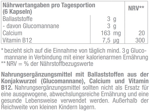 Liste des ingrédients : Glucomannanes (Konjac), hydroxypropylméthylcellulose (capsule), carbonate de calcium, cyanocobalamine (vitamine B12), dioxyde de titane (colorant, selon formulation).