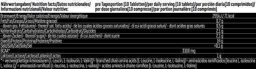 Mode d’emploi : Prendre 5 comprimés deux fois par jour avec un verre d’eau (300 ml) au cours des repas. Les jours d’entraînement, il est recommandé de prendre 5 comprimés avant et 5 comprimés après la séance. Il est important de ne pas dépasser la dose quotidienne recommandée. Conserver à l’abri de la lumière et de la chaleur.
