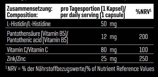 Liste des ingrédients complètes : L-Histidine, Calcium pantothénate (vitamine B5), Vitamine C (acide ascorbique), Zinc (zinc bisglycinate).