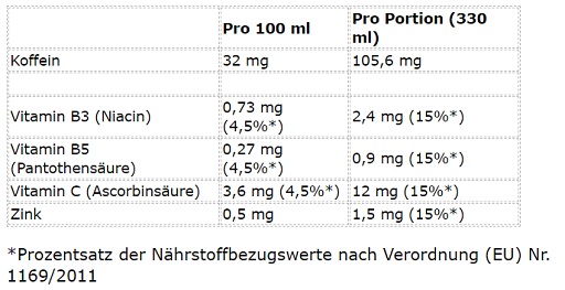 Ingrédients : Eau gazéifiée, arômes naturels, régulateurs d’acidité (acide citrique, acide malique), choline bitartrate, caféine naturelle, L-tyrosine, édulcorant (sucralose), vitamine C (L-ascorbate), gluconate de zinc, extrait de fruit Brainberry® (Aronia melanocarpa), nicotinamide, calcium D-pantothénate.
