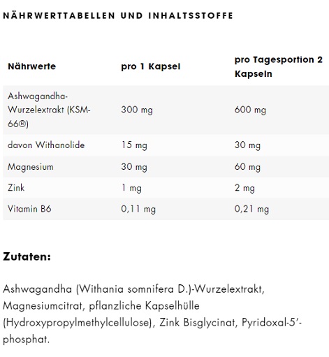 Ingrédients : Extrait de racine d’Ashwagandha (Withania somnifera D., KSM-66®), magnésium (citrate ou trimagnésium dicitrate), capsule végétale (hydroxypropylméthylcellulose), zinc bisglycinate, vitamine B6 (pyridoxal-5’-phosphate), agents de charge microcristallins, anti-agglomérants (sels de magnésium d’acides gras, dioxyde de silicium).