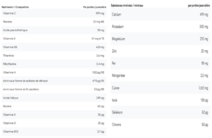 Liste complète des ingrédients : Mélange de vitamines et minéraux (citrate de calcium, citrate de magnésium, citrate de potassium, vitamine E sous forme de tocophérols mixtes, vitamine C comme acide ascorbique, bisglycinates de fer, zinc et manganèse, anti-agglomérants, niacine (nicotinamide), acide folique, acide pantothénique (calcium D-pantothénate), L-sélénométhonine, vitamine D3 (cholécalciférol), biotine, vitamines B6, B12 (methylcobalamine, adénosylcobalamine), vitamine K2 (ménaquinone-7), vitamine A (acétate de rétinyl), potassium iodure, et agents de gélule végétale (hydroxypropylméthylcellulose)).