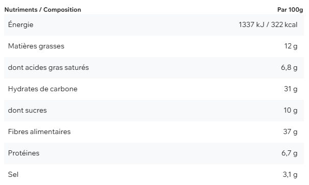 | Ingrédients & Valeurs Nutritionnelles (pour 100 g) | Quantité |