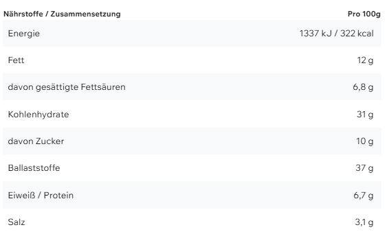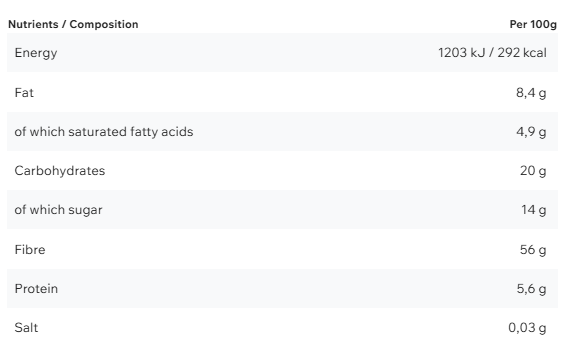 | Ingrédients principaux | Inuline, cacao, morceaux de chocolat (environ 20 %), édulcorants (sucralose, stévia), lactase |