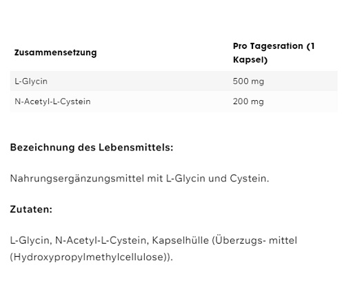 Ingrédients : L-Glycine. N-Acetyl L-Cystéine (NAC). Enveloppe végétale (Hydroxypropylméthylcellulose).
