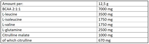 Ingrédients : L-Leucine, L-Isoleucine, L-Valine, L-Glutamine, Citrulline Malate, arômes naturels, édulcorants (si présents selon saveur).