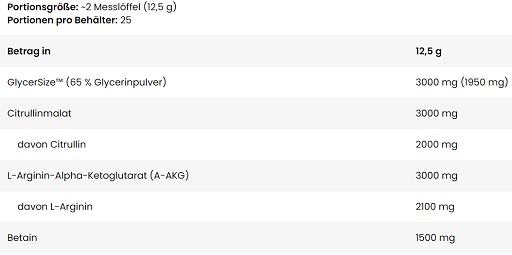Ingrédients : GlycerSize™ (65% poudre de glycérol, anti-agglomérant E551), citrulline malate, L-arginine alpha-cétoglutarate, bétaïne anhydre, arômes, anti-agglomérant (E551), régulateur d’acidité (E296), sel, concentré de jus de betterave rouge, édulcorants (sucralose, acésulfame K), colorants (E160a, E104).