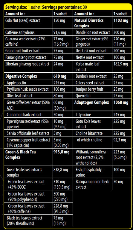 Complexe d’extraits de feuilles de thé vert [45 % EGCG, 90 % polyphénols, 40 % caféine] ( Camellia sinensis (L.) Kuntze), enveloppe de capsule blanche [colorant (E171), gélatine], enveloppe de capsule en gélatine, agent de charge (E460(i)), extrait de racine de pissenlit ( Taraxacum offcinale Web), L-tyrosine, extrait de feuilles de Gotu Kola ( Centella asiatica (L.) Urban), bitartrate de choline, pectine de pomme, extrait de racine de Withania somnifera (2,5 % withanolides) ( Withania somnifera (L.)), extrait de racine de gingembre (5 % gingérols) ( Zingiber offcinale Rosc.), extrait de racine d’Uve Ursi ( Arctostaphylos uva-ursi L.), extrait de feuille de Yerba maté ( Ilex paraguariensis A. St.-Hil.), amidon, extrait de noix de cola (graine) (Cola acuminate) (P.Beauv.) Schott Et Endl), enveloppe de capsule rouge [eau, gélatine, colorants (E171, E122 – peuvent avoir un effet indésirable sur l’activité et l’attention chez les enfants)], extrait de racine d’ortie ( Urtica dioica L.), phosphatidylsérine de poisson , extrait de graines de psyllium ( Plantago afra L.), caféine anhydre, extrait de feuille d’olivier ( Olea europaea L.), extrait de graines de guarana (22 % de caféine) ( Paullinia cupana Kunth), extrait de feuilles de thé noir (20 % de théaflavines) ( Camellia sinensis (L.) Kuntze), extrait de racine de panax ginseng ( Panax ginseng CA Mey.), extrait de pamplemousse ( Citrus paradisi Macfad.), extrait de grain de café vert (50 % ACG) ( Coffea arabica L.), extrait d’herbe de bacopa monnieri ( Bacopa monnieri (L.) Wettst.), extrait d’écorce de cannelle ( Cinnamomum verum J.Presl.), extrait de racine de bardane ( Arctium lappa L.), extrait de graines de céleri ( Apium graveolens L.), extrait de baies de genièvre ( Juniperus communis L.), quercétine, extrait de racine de ginseng sibérien ( Eleutherococcus senticosus (Rupr. et Maxim.) Maxim), extrait de graines de piper nigrum (95% pipérine) ( Piper nigrum L.), feuille de salvia offcinalis extrait ( Salvia ofcinalis L.), extrait de fruit de poivre de Cayenne (1% capsaïcine) ( Capsicum annuum L.), agent de charge (E341), antiagglomérants (E551, E470b).