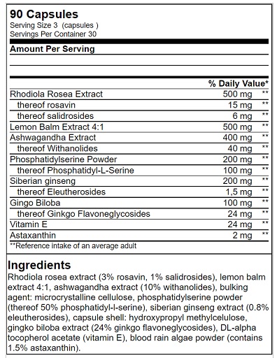 Liste complète des ingrédients : Extrait de Rhodiola Rosea (3% rosavine, 1% salidrosides), extrait de mélisse 4:1, extrait d’Ashwagandha (10% withanolides), cellulose microcristalline (agent de charge), poudre de phosphatidylsérine (50% phosphatidyl-L-sérine), extrait de ginseng sibérien (0,8% éleuthérosides), enveloppe de gélule végétale (hydroxypropylméthylcellulose), extrait de ginkgo biloba (24% glycosides flavonol), DL-alpha tocophérol (vitamine E), poudre d’algue rouge (1,5% astaxanthine).