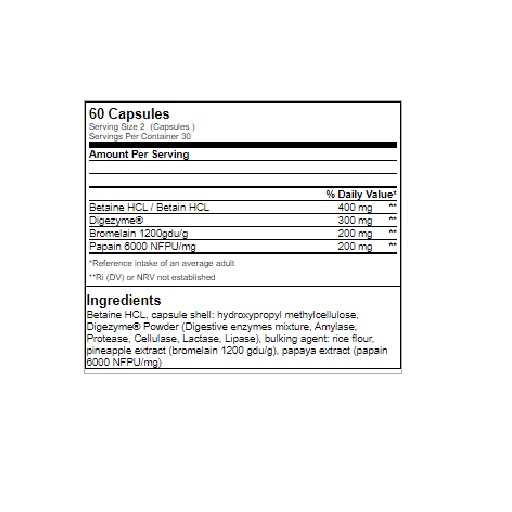 Liste des Ingrédients : Betaine HCL, enveloppe de la capsule : hydroxypropylméthylcellulose, Digezyme® (mélange d’enzymes digestives : amylase, protease, cellulase, lactase, lipase), agent de charge : farine de riz, extrait d’ananas (bromelain 1200 gdu/g), extrait de papaye (papain 6000 NFPU/mg).
