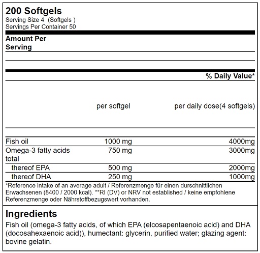 | Acides gras Oméga-3 totaux | 750 mg | 3000 mg |