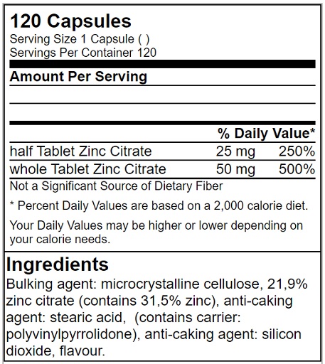 | Zinc (sous forme citrate de zinc) | 50 mg | 500 % |
