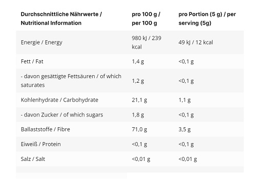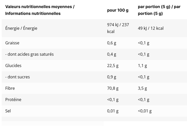 | Ingrédients | Quantité / Valeur nutritionnelle (pour 5 g) |