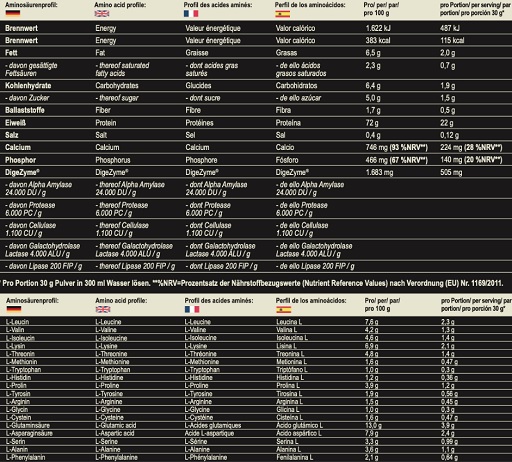 Ingrédients : Protéine de lait (concentrat de protéines de lactosérum, émulsifiant (lécithine)) 92,3 %, poudre de cacao écrémé, arôme, complexe enzymatique DigeZyme® (alpha‑amylase, protéase, cellulase, galactohydrolase, lactase, lipase), édulcorant (sucralose).