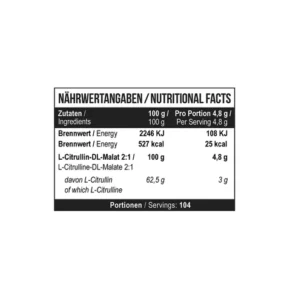 Ingrédients : L-Citrulline DL-Malate 2:1 (mélange de L-Citrulline et acide malique)