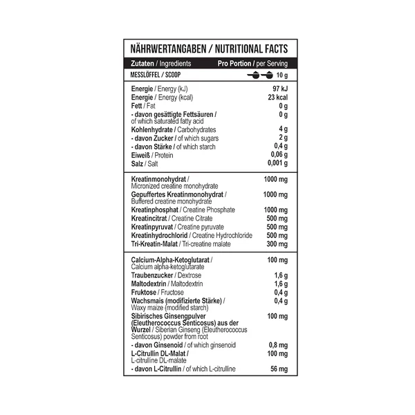 - Formule exclusive multi-créatine : créatine phosphate, monohydrate (micronisée et tamponnée), citrate, pyruvate, hydrochloride, tri-créatine malate