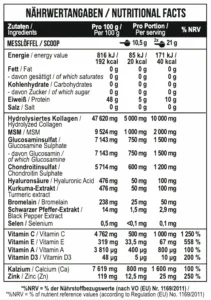 Liste complète des ingrédients : Collagène hydrolysé (de bovin), sels de calcium de l’acide orthophosphorique, méthylsulfonylméthane (MSM), sulfate de glucosamine (de crustacés), sulfate de chondroïtine, acide L-ascorbique, acidifiant (acide citrique), antimousse (dioxyde de silicium), acétate de DL-alpha-tocophéryle, arômes, édulcorant (sucralose), extrait de racine de curcuma (Curcumin longa) (standardisé à 95 % de curcumine), bromélaïne (d’Ananas comosus 1200 GDU/g), acide hyaluronique, oxyde de zinc, acétate de rétinyle, cholécalciférol, colorant (rouge betterave), extrait de poivre noir (Piper nigrum) (25-35:1) (standardisé à 95 % de pipérine), sélénite de sodium.