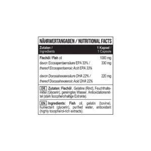 Ingrédients : Huile de poisson. EPA (acide eicosapentaénoïque). DHA (acide docosahexaénoïque). Autres acides gras oméga-3. Capsule gélatine (bœuf).
