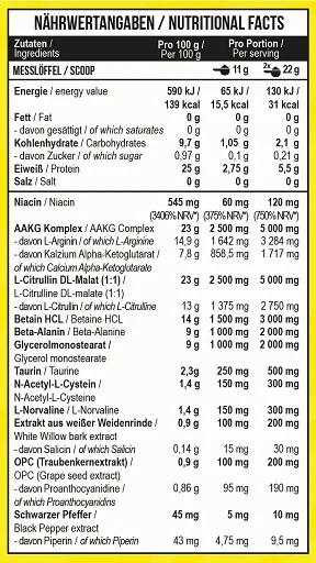 Liste complète des ingrédients : Complexe AAKG (L-arginine, alpha-cétoglutarate de calcium), DL-malate de L-citrulline (1:1), chlorhydrate de bétaïne, monostéarate de glycérol, bêta-alanine, maltodextrine, acide (acide citrique) taurine, arômes, agents antiagglomérants (sili-ciumdioxid, sel de calcium de l’acide orthophosphorique), N-acétyl-L-cystéine, L-norvaline, OPC – extrait de pépins de raisin 120 : 1 (Vitis vinifera) standardisé à 95 % de proanthocyanidines, extrait d’écorce de saule 8:1 (Salix alba L.) standardisé à 15 % de salicine, édulcorants (sucralose, acésulfame-k), niacine, extrait de fruit de poivre noir 35:1 (Piper nigrum) standardisé à 95 % de pipérine.