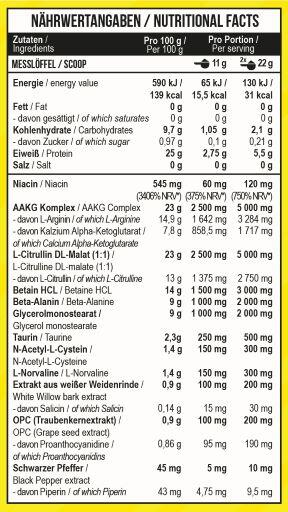 Complexe AAKG (L-Arginine, Alpha-Cétoglutarate de Calcium), L-Citrulline DL-Malate (1:1), Chlorhydrate de Bétaïne, Monostéarate de Glycérol, Bêta-Alanine, Maltodextrine, Acide (Acide Citrique) Taurine, Arômes, Anti- Agents agglomérants (Dioxyde de silicium, sel de calcium de l’acide orthophosphorique), N-acétyl-L-cystéine, L-Norvaline, OPC – extrait de pépins de raisin 120 : 1 (Vitis vinifera) standardisé à 95 % de proanthocyanidines, extrait d’écorce de saule 8 : 1 (Salix alba L.) standardisé à 15 % de salicine, édulcorants (sucralose, acésulfame-k), niacine, extrait de fruit de poivre noir 35:1 (Piper nigrum) standardisé à 95 % de pipérine.