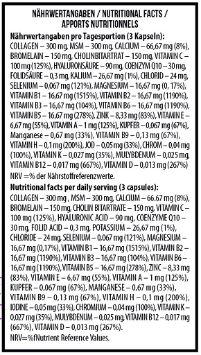 Liste complète des ingrédients : Vitamine A, Vitamine C, Vitamine D, Vitamine E, Vitamines B1, B2, B5, B6, B9, Biotine, Collagène, MSM, Coenzyme Q10, agents de gélule (excipients naturels), capsule (gélatine bovine).