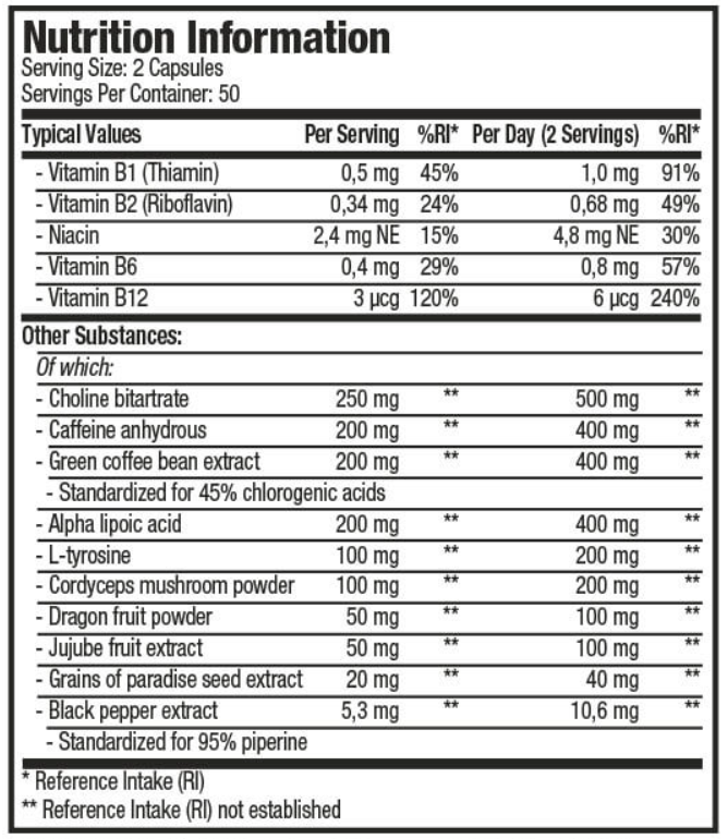 Liste complète des ingrédients : Capsule végétale (hypromellose, eau, colorant oxyde de fer), choline bitartrate, caféine anhydre, alpha-lipoïque, extrait de café vert (Coffea canephora), L-tyrosine, poudre de cordyceps (Cordyceps sinensis), agents anti-agglomérants (sels de magnésium d’acides gras, dioxyde de silicium), extrait de jujube (Ziziphus jujuba), stabilisant (cellulose), extrait de grains of paradise (Aframomum melegueta), huile de colza, extrait de poivre noir (Piper nigrum), méthylcobalamine, niacinamide, thiamine hydrochloride, pyridoxine hydrochloride, riboflavine.