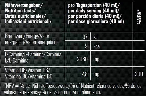 Ingrédients : Eau, L-carnitine 5%, fructose, acidifiant: acide citrique, arôme, conservateur: sorbate de potassium, édulcorants: cyclamate de sodium, acésulfame K, saccharine; pyridoxine HCI (vitamine B6), émulsifiant: mono et diglycérides d’acides gras, colorant: jaune orangé FCF*.