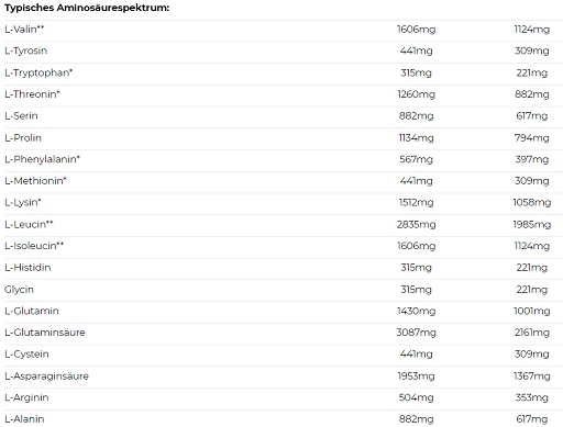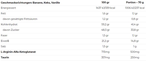 Ingrédients : Concentré de protéines de lactosérum, maltodextrine, glucose, fructose, isomaltulose (Palatinose™), fibres de blé (sans gluten), L-glutamine, arômes, L-leucine, agents stabilisants (gomme d’acacia, gomme xanthane), L-arginine alpha-ketoglutarate, L-isoleucine, L-valine, taurine, agents anti-agglomérants (phosphate de calcium, dioxyde de silicium), prémélange vitaminique (acide L-ascorbique, DL-α-tocophéryle acétate, nicotinamide, calcium D-pantothénate, cyanocobalamine, chlorhydrate de pyridoxine, riboflavine, mononitrate de thiamine, acide folique, D-biotine), édulcorants (sucralose, glycosides de stéviol), colorant (bêta-carotène).