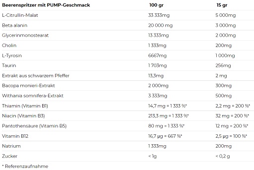 Liste complète des ingrédients : L-citrulline malate, bêta-alanine, glycérol monostéarate, choline L-bitartrate, L-tyrosine, taurine, extrait de Bacopa monnieri, extrait de Withania somnifera (KSM-66 Ashwagandha), extrait de poivre noir (Bioperine®), vitamines B1, B3, B5, B12, sodium, arômes, édulcorants (sucralose, glycosides de stéviol), agents anti-agglomérants.