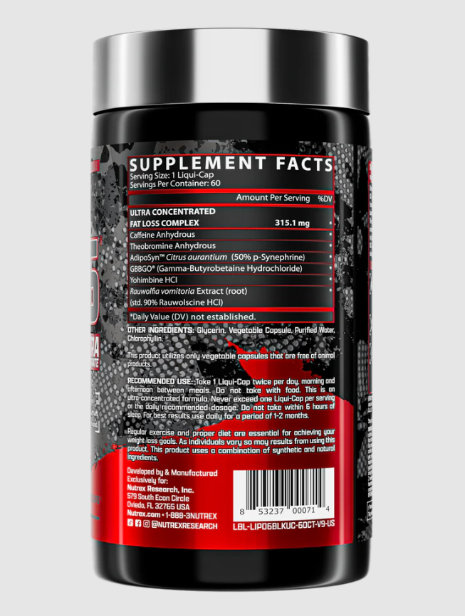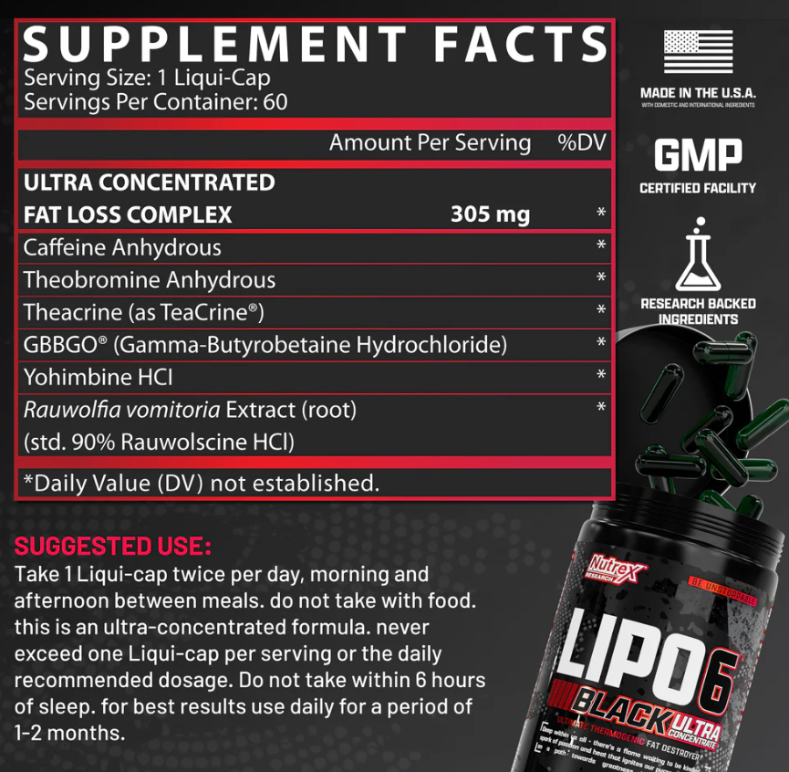 Cette formule exclusive contient des ingrédients innovants tels qu’AdipoSyn™ (Citrus aurantium), GBBGO® (précurseur de L-carnitine), Rauwolfia vomitoria, ainsi que de la caféine anhydre et de la théobromine. Ensemble, ils favorisent une thermogenèse intense, aident à libérer les graisses tenaces, améliorent l’endurance pendant l’exercice et soutiennent la clarté mentale durant les régimes hypocaloriques. Lipo 6 Black Ultra est ainsi idéal pour briser les plateaux de perte de poids, optimiser la gestion du poids et accélérer la transformation corporelle.