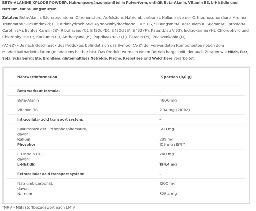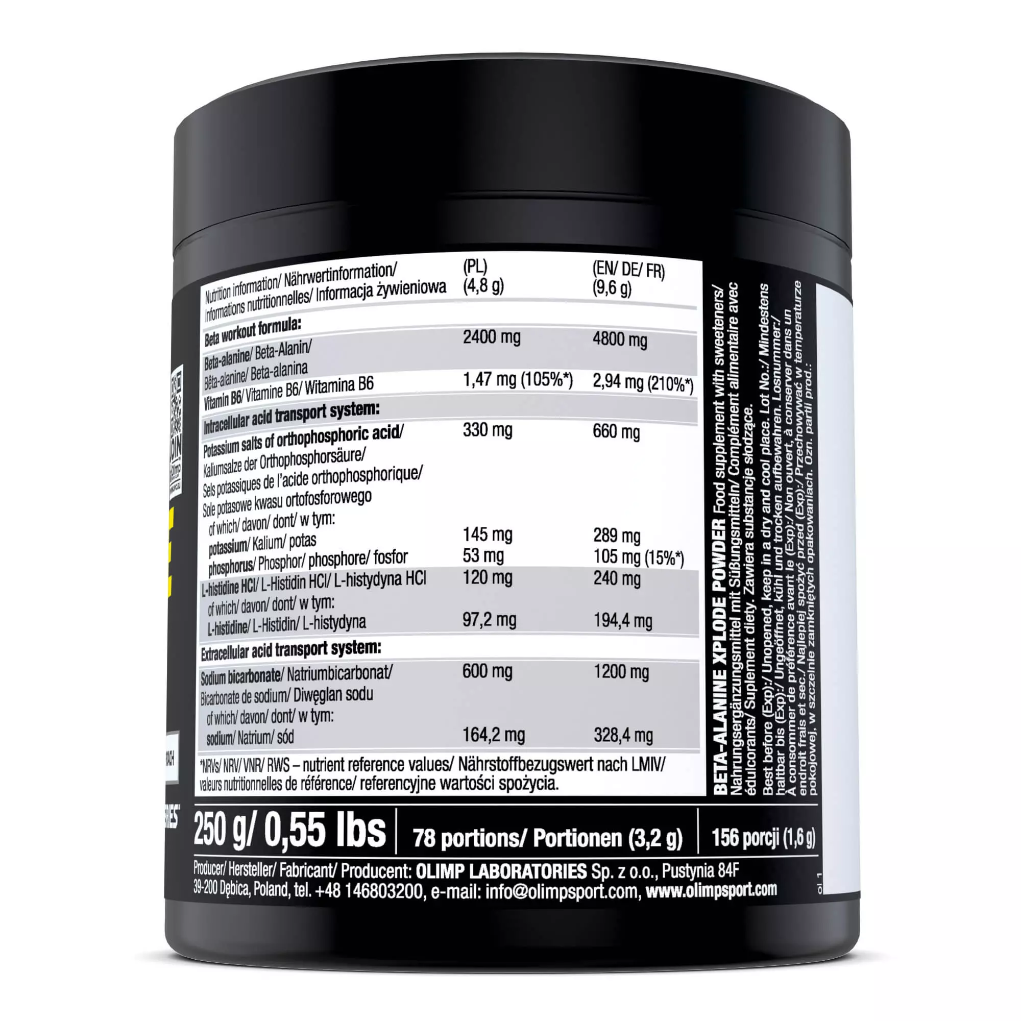 Olimp® Beta-Alanine Xplode Powder 250g est un complément alimentaire spécialement formulé pour les sportifs pratiquant des activités intenses nécessitant endurance, force et récupération rapide. Ce produit de la gamme Xplode® d’Olimp® est élaboré avec des ingrédients de haute qualité, micronisés pour une excellente solubilité et une absorption optimale. Il contient 43,3 % de bêta-alanine, un acide aminé reconnu pour retarder la fatigue musculaire, ainsi que des agents régulateurs d’acidité (acide malique et citrique), du bicarbonate de sodium, et des sels minéraux essentiels. Enrichi en vitamine B6, il bénéficie de formulations rigoureuses sans substituts bon marché, garantissant des standards pharmaceutiques stricts.