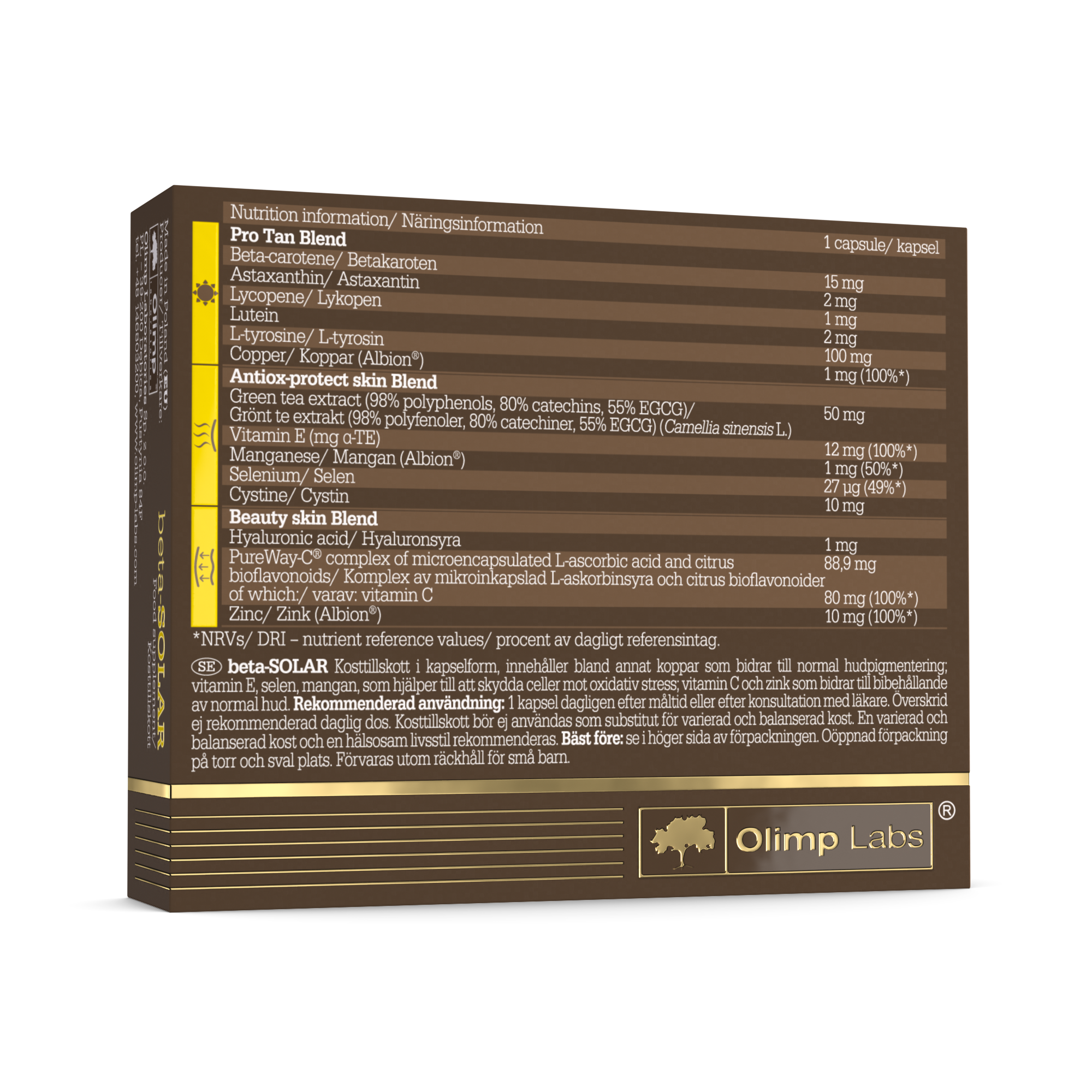 Cette formule avancée d’Olimp® Beta Solar est idéale pour améliorer la qualité de votre bronzage tout en renforçant la santé et l’éclat de votre peau. Sa combinaison unique d’antioxydants, vitamines et minéraux garantit un soutien cutané complet face aux agressions solaires.
