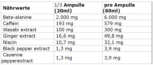 Ingrédients : Eau purifiée, bêta-alanine, caféine, extrait de wasabi (Wasabia japonica), extrait de gingembre (Zingiber officinale), niacine (vitamine B3), extrait de poivre noir (Piper nigrum), extrait de piment de Cayenne (Capsicum annuum), édulcorants, arômes naturels d’agrumes.