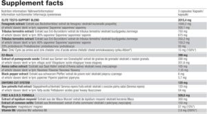 Liste complète des ingrédients : Fenugrec (Trigonella foenum-graecum), extraits de Tribulus terrestris (90% et 60% saponines), racine de Maca (Lepidium meyenii), extraits de grenade (Punica granatum), avoine (Avena sativa), ortie (Urtica dioica), fruit de Sabal minor, poivre noir (Piper nigrum), zinc bisglycinate, magnésium malate, magnésium oxyde, vitamine B6 (pyridoxine), agents d’enrobage et anti-agglomérants conformes aux normes alimentaires, enveloppe de la capsule (gélatine bovine).