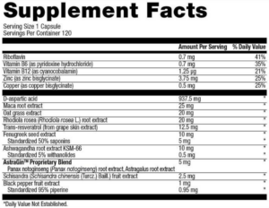 Liste complète des ingrédients : Acide D-Aspartique, extrait d’avoine (Avena Sativa), trans-resvératrol (extrait de peau de raisin), extrait de racine de maca (Lepidium meyenii), extrait de fenugrec, zinc chélaté (Albion™), extrait d’ashwagandha KSM-66, extrait de racine de rhodiola rosea, extrait de magnolia berry, extrait de poivre noir standardisé à 95% en pipérine, agents de remplissage (cellulose microcristalline), antiagglomérants (stéarate de magnésium végétal, dioxyde de silicium), cyanocobalamine – vitamine B12, chlorhydrate de pyridoxine – vitamine B6, riboflavine – vitamine B2, gélule (gélatine, colorant : E171).