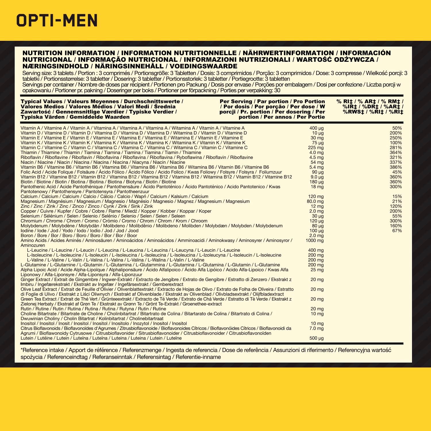 Opti-Men combine plus de 75 ingrédients actifs dont 21 vitamines et minéraux essentiels, un complexe complet de vitamines B à plus de 275 mg par prise (3 comprimés), ainsi qu’1 gramme d’acides aminés libres pour une récupération musculaire optimale. Ce complément intègre également des extraits botaniques, des concentrés de fruits et légumes, et des antioxydants (vitamines A, C, E) pour une protection cellulaire renforcée. Son action favorise la production d’énergie, la force physique et le maintien d’une bonne immunité, s’intégrant parfaitement dans un mode de vie sportif et sain.